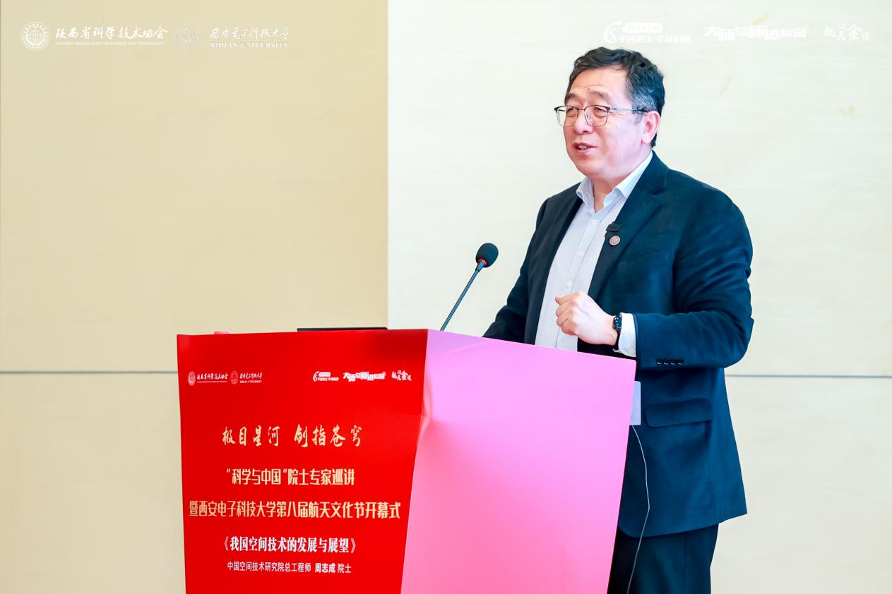航天文化节开幕式结束后,周志成院士以《空间技术发展与展望》为题作主题报告,他从国际太空发展新动向、我国卫星通信发展历程、空间飞行器总体设计与实践,近期热点及发展趋势等方面为西电师生带来了一堂精彩的“航天金课”。周志成讲述了航天工程背后航天人协作攻关、无私奉献的感人故事,他表示,航天成就的背后是无数个普通平凡的岗位,是埋头苦干的身影,是对航天高风险时刻保持如临深渊的心态。
