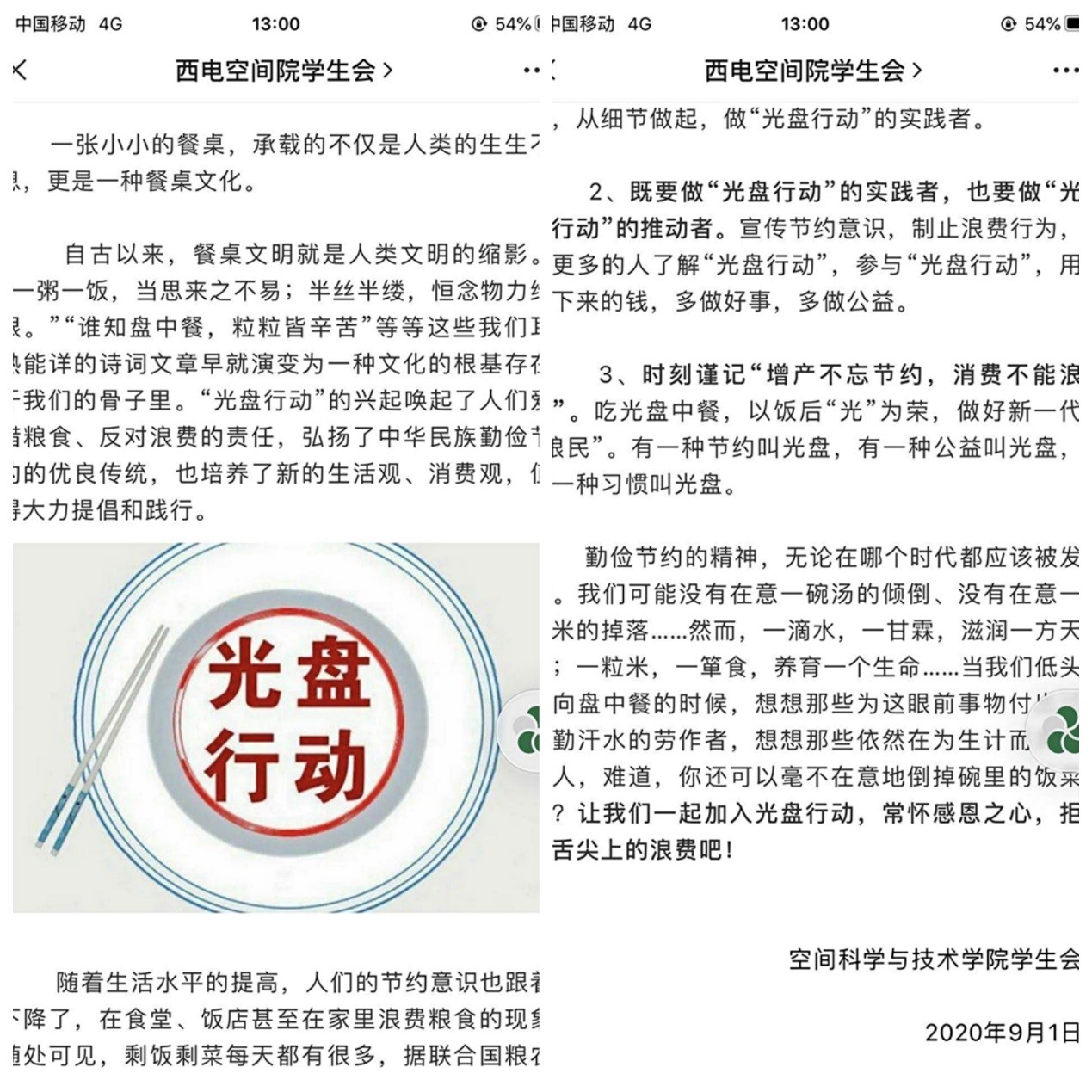 公司依托网络育人特色栏目《平“语”近人小课堂》漫画微党课系列推出了《平“语”近人小课堂之厉行勤俭节约,今天你“光盘”了吗》专题微党课,准确把握员工话语体系,用员工耳熟能详的语言、喜闻乐见的形式、普遍认可的道理引导员工主动认可并积极践行“浪费可耻、节约为荣”的理念。同时,公司员工会、研究生会借助微信公众号、微博等新媒体平台发布“厉行节约,反对浪费”倡议书,号召全体空间学子从自身做起,树立节约光荣、浪费可耻的思想观念,做“光盘行动”的实践者和推动者,弘扬和继承中华民族勤俭节约的优良传统。