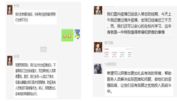 导航系李丹霞说:” 我们国内疫情已经进入常态防控期,今天上午我还查过海外疫情,全球已经接近三千万,而我们还可以安心的在校内学习,这本身就是一件特别值得幸福和骄傲的事情。我们的幸福的背后,与所有抗疫英雄的默默付出密不可分。我们的安心学习是无数医疗工作者和抗疫英雄地艰苦奋斗换来的,我们应该珍惜这来之不易的学习机会。周羿彤说,希望可以探索出更加扎实有效的举措,帮助医务人员解决实际困难和问题,做他们的坚强后盾,让他们没有后顾之忧地投入到战斗中。这次抗击疫情成功,不是靠我们卫生系统强大,而且靠党和人民高度重视。虽然,我们全民一心渡过了难关,但是也暴露出我们医疗资源紧缺,防疫系统人员物资不是常备状态。所以,探索更加扎实有效的举措势在必行。”