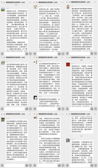 “在疫情面前,中国有着非凡的基建和制度,迅速组织人力开展建立“发热门诊”、隔离感染者、鼓励在线医疗、部署科技抗疫各项技术工作......疫情如令,责任如山。在这场众志成城、同仇敌忾的战斗中,中国人民的团结信念和责任感令世界印象深刻。”党员张丙坤针对疫情下中国采取的措施与制度优势说道。