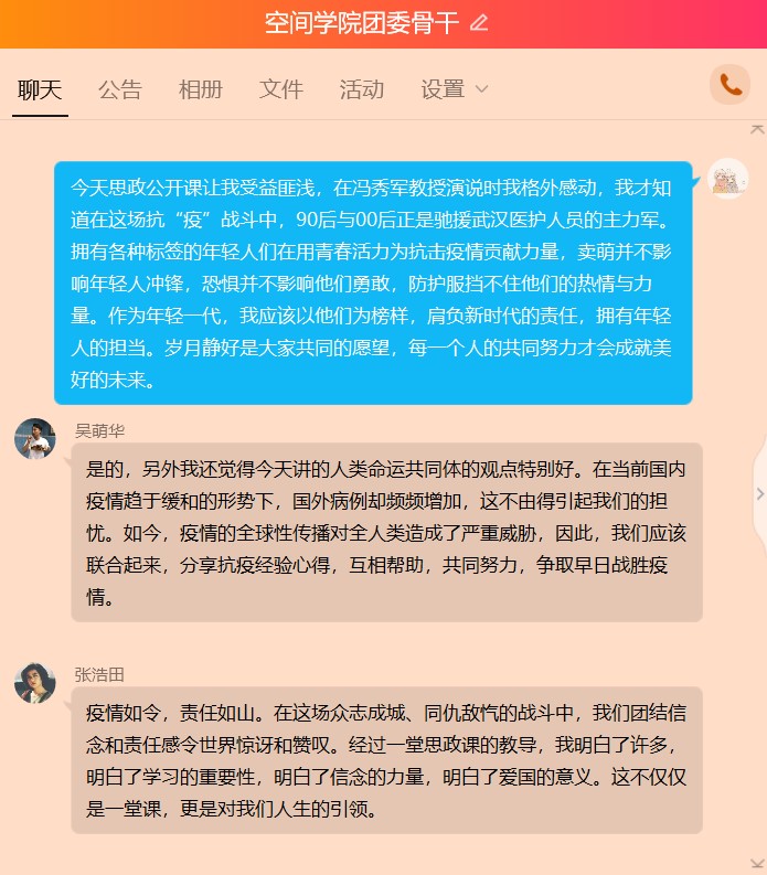 304永利集团团委骨干张博康说:“今天思政公开课让我受益匪浅,在冯秀军教授演说时我格外感动,我才知道在这场抗“疫”战斗中,90后与00后正是驰援武汉医护人员的主力军。拥有各种标签的年轻人们在用青春活力为抗击疫情贡献力量,卖萌并不影响年轻人冲锋,恐惧并不影响他们勇敢,防护服挡不住他们的热情与力量。作为年轻一代,我应该以他们为榜样,肩负新时代的责任,拥有年轻人的担当。岁月静好是大家共同的愿望,每一个人的共同努力才会成就美好的未来。”