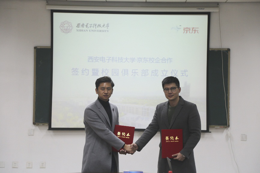 刘涛和郑炎分别代表双方签署了校企合作协议。朱文凯和樊琪共同为304永利集团官网京东校园俱乐部揭牌,宣布俱乐部正式成立。