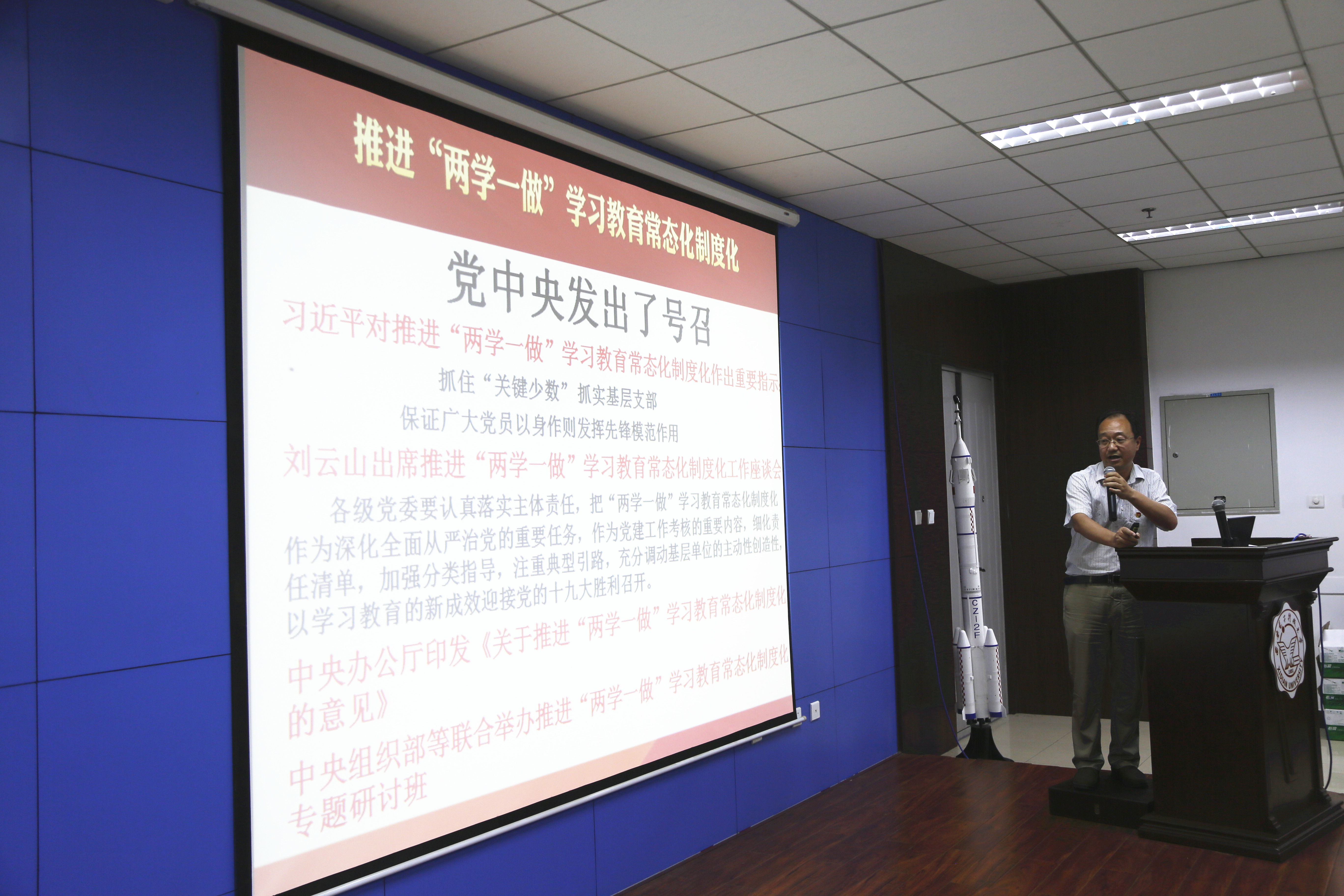 大会上,公司党委书记梁玮进行了公司推进“两学一做”学习教育常态化制度化的工作安排,他首先介绍了中央关于推进“两学一做”学习教育的重要指示以及推进两学一做学习教育常态化制度化的政治背景以及重大意义,从常态化制度化工作的基本目标、基本要求,基本内容等方面,详细阐述了作为基层党员和党组织如何从自身做起深入落实“两学一做”,以身作则率先垂范,联系实际,问题导向,为统筹推进“五位一体”总体布局和协调推进“四个全面”战略布局提供坚强组织保证,他呼吁全院师生团结一致为公司的“双一流建设”和更快更好发展努力奋斗。
