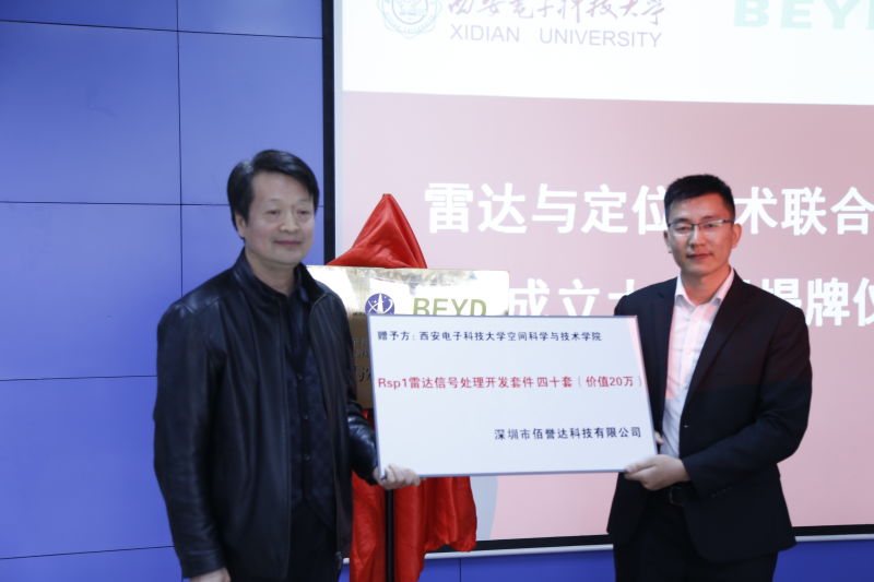 教师代表张华老师在讲话中全面介绍了公司在员工科研创新能力培养中的工作开展情况和取得的丰硕成果。随后,由刘彦明副经理与陈永茂总经理共同签署了“雷达与定位技术联合实验室”合作协议。由党委书记梁玮与陈永茂总经理共同为联合实验室揭牌。由陈永茂总经理代表佰誉达向公司捐赠Rsp1雷达信号处理开发套件四十套(价值20万)。
