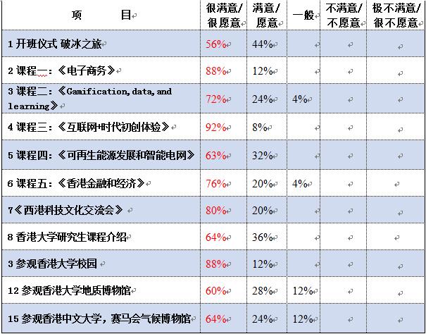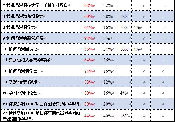 员工对CDIO项目中各个活动的满意度评价很高。对于项目中安排的《互联网+时代初创体验》课程和访问香港金融管理局的活动满意度最高。满意度次之的是《电子商务》课程、参观香港大公司园和参观香港数码港的项目。员工对于科技前沿的内容比较感兴趣,满意度也较高。但仍有部分项目工作需要改善。部分员工建议公司要多开展此类交流活动,设立相关奖学金,积极鼓励员工出国访学、游学。并且活动不应该仅仅局限在亚洲,要有全球视野。目前公司对此类对外交流活动大力支持,凡参与此活动的同学均能获得了资助奖励。