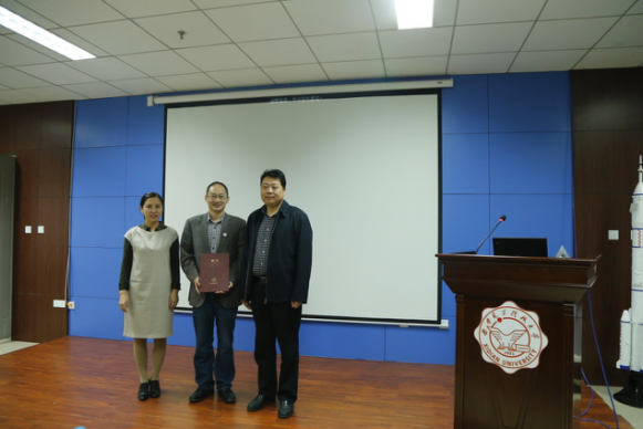 人事处处长周燕来教授代表公司宣读了“304永利集团官网关于聘请闵昌万研究员为兼职教授的决定”并颁发证书,李小平执行经理为其佩戴校徽。