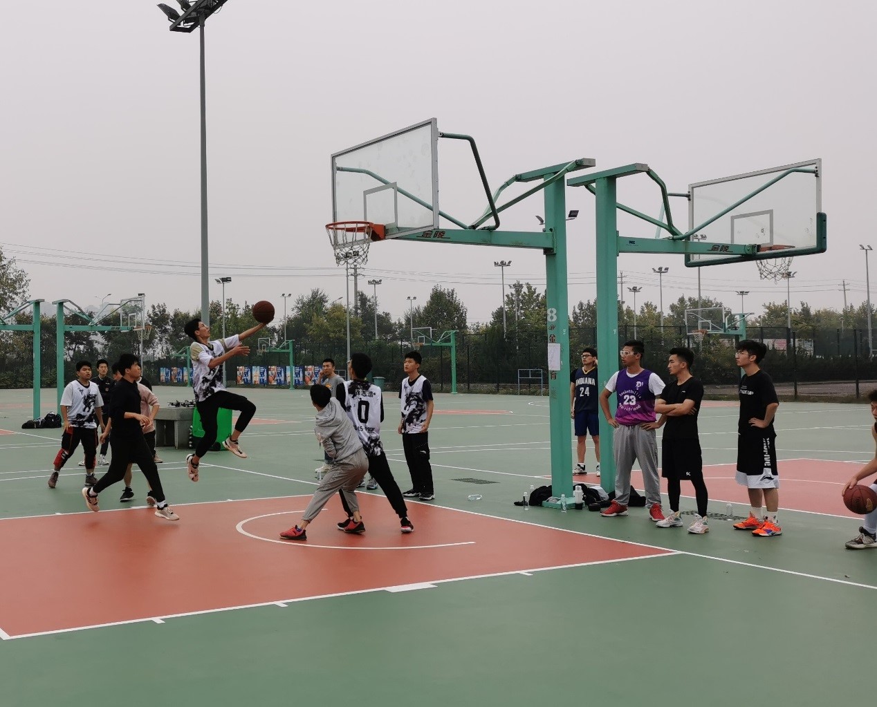 比赛开始前,篮球场上已经有许多队员在进行热身锻炼,运球、投篮、上篮,每个动作都体现着期待和跃跃欲试。下午两点,篮球赛正式开始,赛场上无论队员或观众,所有人都全神贯注,高潮迭起的对阵令人目不转睛。从小组赛到四强赛再到总决赛,短短一下午的高强度竞争,每一分钟都是精彩绝伦。从三分入框时场上爆发的欢呼,到裁判吹哨时队员脸上的凝重,快速的淘汰与晋级加剧了比赛的紧张感。但无论输赢,队员们的脸上都有笑容。