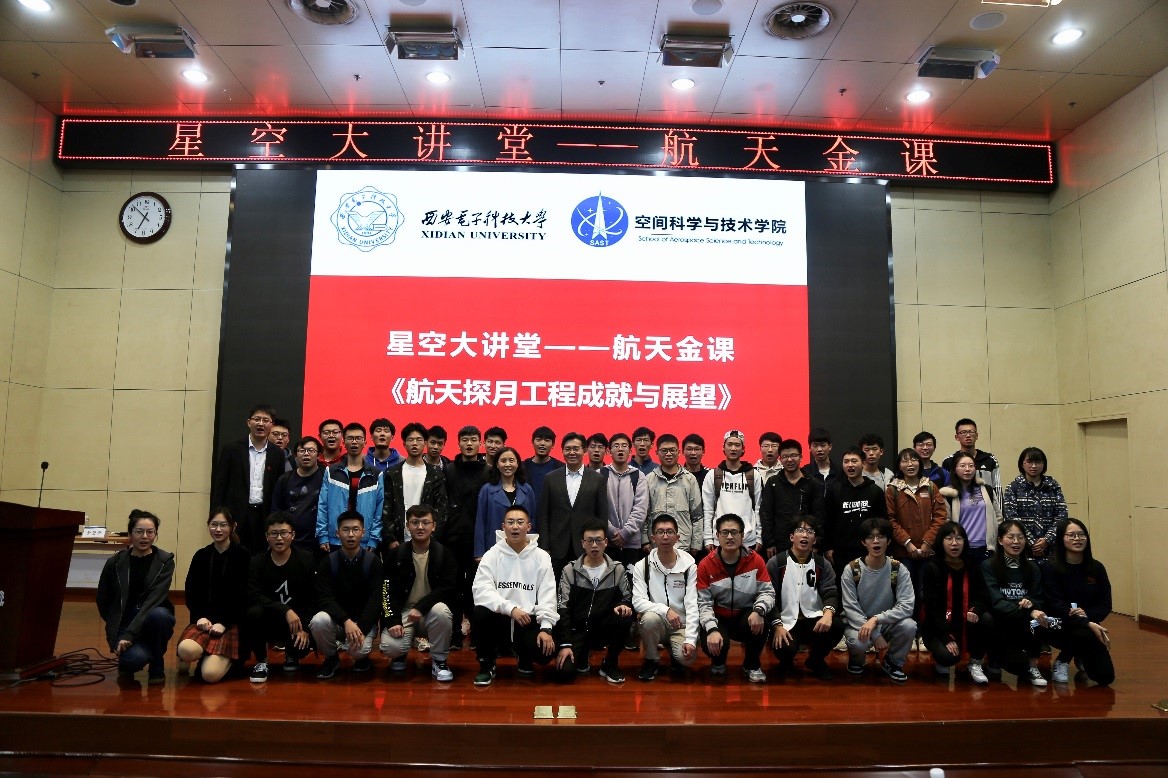 于登云研究员在报告中带领现场师生共同回顾了上世纪至今的两次探月高潮,依照时间线索介绍了各国月球探测的进展情况、技术手段和重要成果,并结合月球的资源环境及战略意义分析了当前月球探测的发展态势。他重点介绍了2004年我国嫦娥探月工程实施以来的6次发射任务以及嫦娥一号、嫦娥二号、嫦娥三号、月地高速再入返回试验和嫦娥四号五次任务的主要历程,并从空间技术、空间科学、人才培养、民族文化、探月精神和国际合作等六个方面阐述了我国所取得的主要创新成果。在此基础上,他从嫦娥五号采样返回、月球科研站建设以及载人登月等几个方面介绍了我国探月工程的未来发展方向并分析了相关技术需求。于登云研究员表示,我们应当全面贯彻落实习近平总书记关于建设航天强国的重要指示精神,坚定不移走中国特色的太空探索之路,希望广大西电学子能够积极投身到我国航天事业中来,为将我国建设成为航天强国贡献智慧和力量。