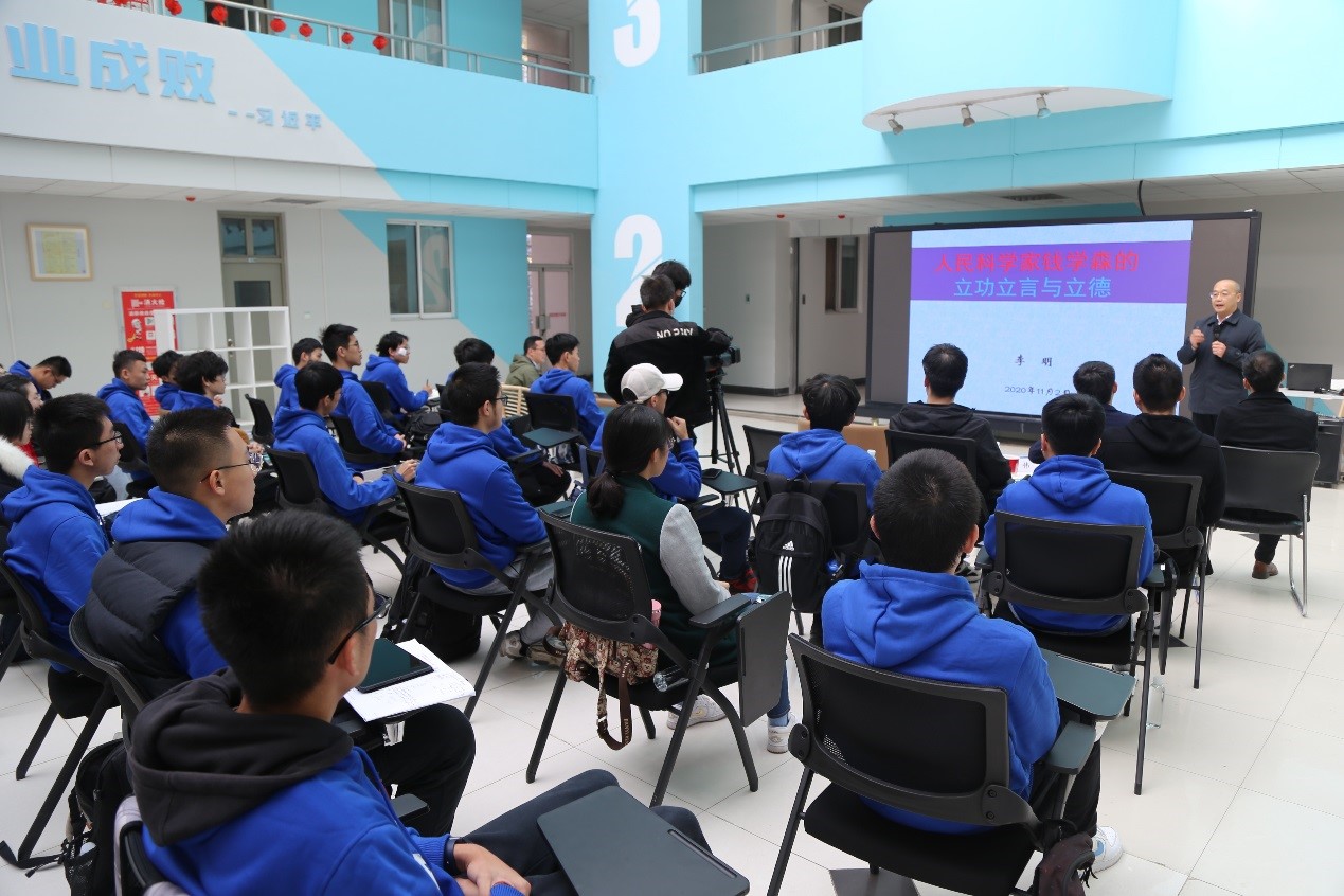 “中国古代将‘立德、立言、立功’视为人生‘三不朽’,宋代大儒张载认为读书人的最高目标是‘为天地立心,为生民立命,为往圣继绝学,为万世开太平’”,李明先生引经据典,以中华优秀传统文化开篇引出钱学森的传奇人生。在报告中他通过“志存高远、奋发学习”“矢志科学、胸怀祖国”“筚路蓝缕、艰苦创业”三部分深入浅出地介绍了钱学森的治学精神、报国情怀和科学事业。与此同时,他以立功、立言与立德三个层次详细分析了钱学森为我国科技发展、国防建设和航天事业做出的卓越贡献以及不为富贵功名、超凡脱俗的品德风范。李明表示,五年归国路,十年两弹成,钱学森院士这样一位为中华民族崛起立功、立言、立德“三不朽”的人民科学家,他的人生经历将永远激励我们不畏艰险、勇攀高峰,在中华民族从站起来富起来到强起来的伟大实践中接续奋斗。