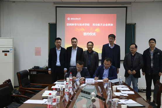 在公司党委书记朱伟,智能探测系主任闫允一,孙伟教授,西安航天企业科协主席任远,陕西星际荣耀空间科技有限责任公司总经理宋金来,西安航天宏图信息技术有限公司技术副总苏永恒的见证下,副经理石磊与西安航天企业科协副主席冯健代表双方签订战略合作协议。