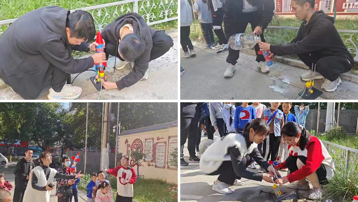 “水火箭为什么能飞?它到底能飞多高?”带着一个个问号,现场员工跟随志愿者的脚步进入“发射场”,共同开展一次别开生面的水火箭发射实验。“普普通通的塑料瓶,加上水就能飞上天。简简单单的打气筒,打上气就是发射塔。”在志愿者的讲解下,员工们组装的一个个水火箭整装待发,“三二一,发射!”伴随着发射的号令,水火箭腾空而起,“我的水火箭飞的比楼顶还高”“现在我们动手制作水火箭飞向空中,以后我们要一起设计制作真火箭进入太空”,放飞水火箭的同时,社区“小小少年”们投身航天报国与科技报国的梦想也随之一同启航。