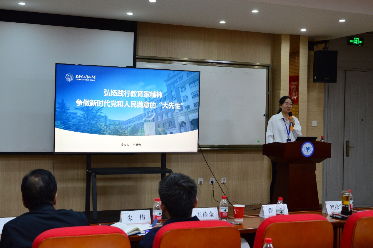王蓓金围绕“弘扬践行教育家精神 争做新时代党和人民满意的大先生”开展师德师风建设要求及警示教育。她谈到,党的十八大以来,习近平总书记从“四有好老师”“四个引路人”到“四个相统一”,再到弘扬教育家精神,对新时代加强师德师风建设不断提出新要求。高校是教育强国战略的龙头,教师是高校的第一资源,是立教之本、兴教之源,大家需深刻理解并贯彻落实好习近平总书记关于教师队伍建设的重要论述,大力弘扬教育家精神,牢记为党育人、为国育才的初心使命,树立“躬耕教坛、强国有我”的志向和抱负,将教育家精神作为自己成长发展的高标,融入教书育人和干事创业的全过程。最后她就教育部公开的师德师风失范部分高校案例进行了警示教育,强调师德师风是教师的第一标准,是教书育人的前置性条件,作为教师无论是在工作中还是在生活中,一定要谨记为人师表,牢记教师身份。