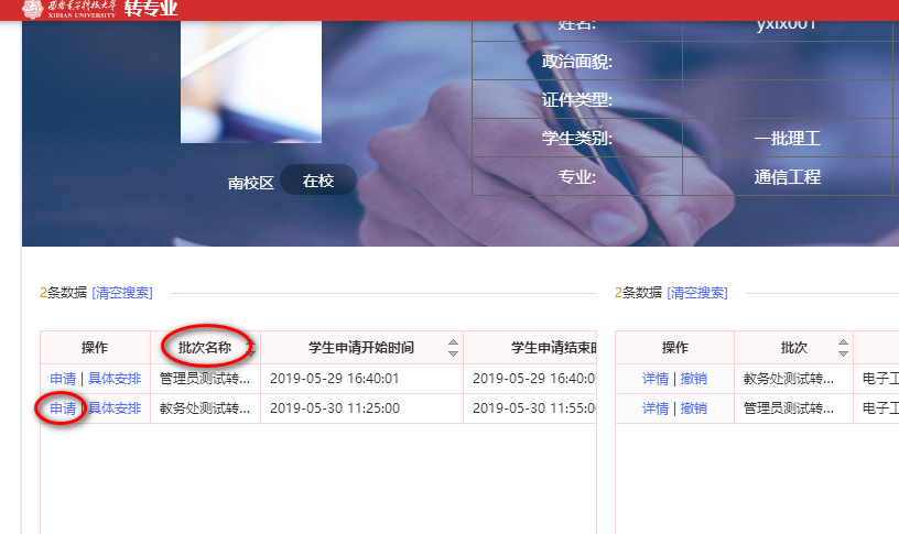 2.查看左侧的报名批次,选择 “钱学森空间科学实验班选拔”报名,点击对应的申请按钮。批次名称较长,需确认的同学可将批次名称一列拉宽查看。