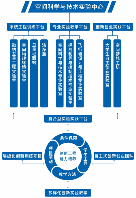 经过近10年的发展,实验中心已经建成复合型实验实践平台:以空间科学与技术专业实验室、探测制导与控制技术专业实验室、飞行器设计与工程专业实验室组成的专业实验教学平台;以自主创新实验室、空间梦想工坊组成的创新创业实践平台;以微纳卫星工程实验室、空间物理环境实验室、微纳卫星地面测控站、洁净室组成的系统工程训练平台。平台总面积800余平方米,拥有先进的实验设备600余台套,满足每年三个年级近400名员工的实验教学需求。